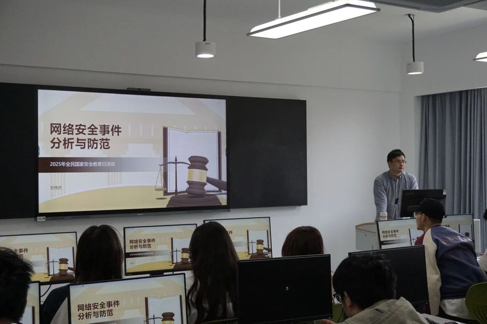 为增强同学们的网络安全意识,提升应对网络威胁的能力,计算机技术与工程学院专职教师刘伟杰老师于4月16日中午12:00在实训楼70303教室为学生代表讲授了主题为 “网络安全事件分析与防范” 的专题讲座。